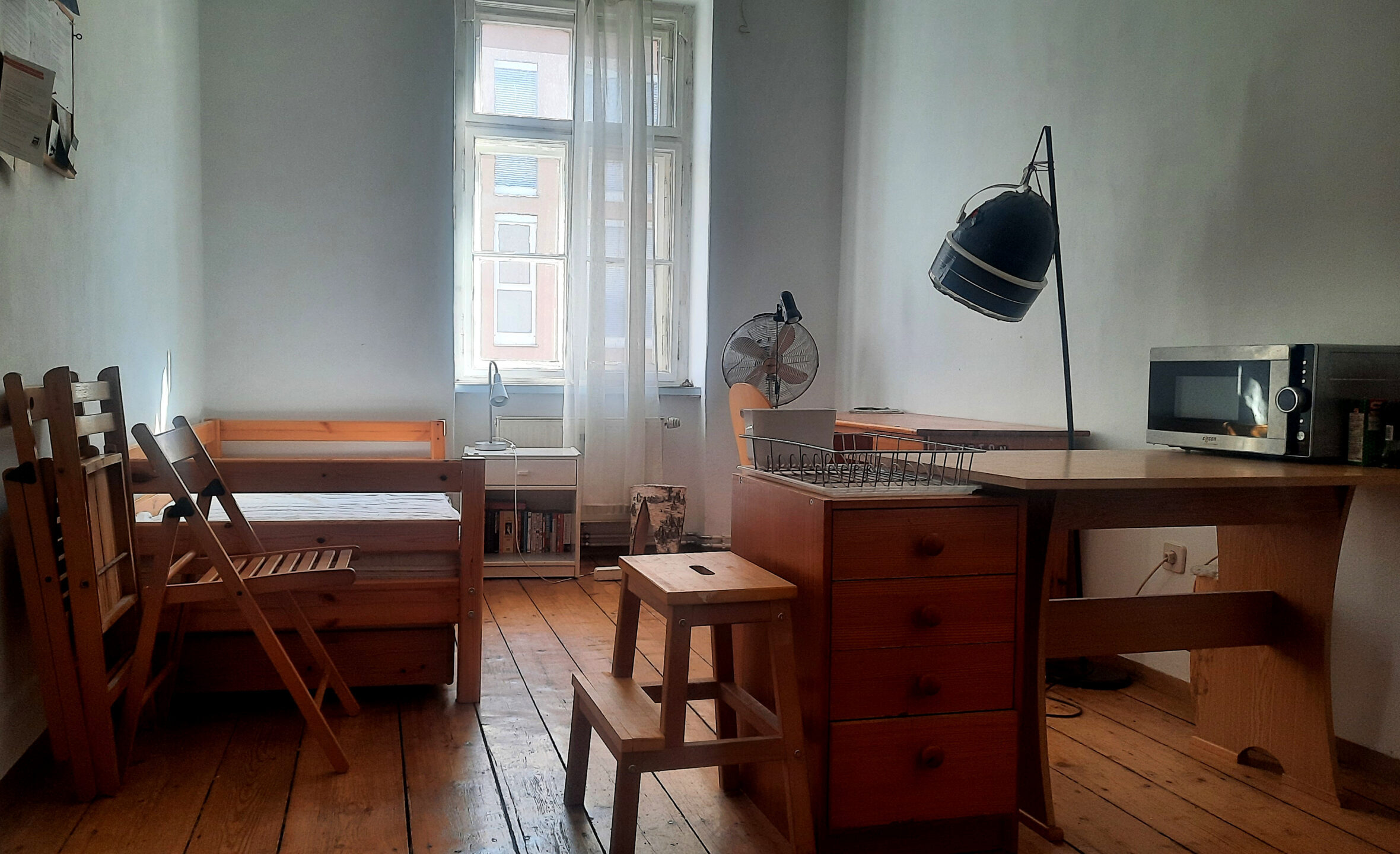 The flat has 2 rooms with 2 beds, a kitchenette and bathroom. Toilet is in the building. of course you have access to mur.at’s speedy WiFi 🙂